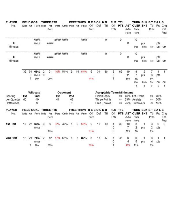 | Team Stats | 38 | 70 | 54.3 | 36 | 50 | 72.0 | 2 | 20 | 10.0 | 9 | 15 | 60.0 | 6 | 29 | 35 | 20 | 7 | 2.9 | 7 | 1 | 1 | 1 | 8 | 1 | 87 | ||
